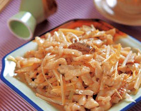 5.加高汤25克调味,放入鱼丝,淋花椒油颠翻出勺。
