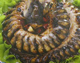 2.晒干后的鳗肉称为鳗鲞,食用时可用水发之,切丝入汤,味道也很好;鳗鲞以产于浙江沿海的产品质量最佳;若不用水发,加绍酒、葱结、姜片,上笼隔水蒸15分钟后去皮骨,味道更美;